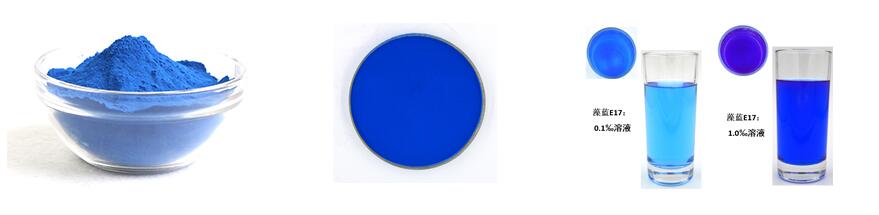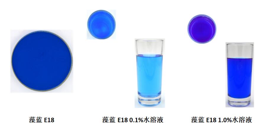 Spirulina Extract E18 is blue to dark blue powder, main characteristics: bright, good transparency, no peculiar smell; easily soluble in water, the solution is bright blue to dark blue